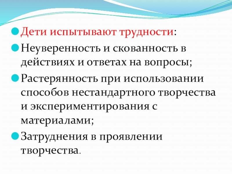 Дети испытывают трудности: Неуверенность и скованность в действиях и ответах на вопросы;Растерянность при использовании способов нестандартного творчества