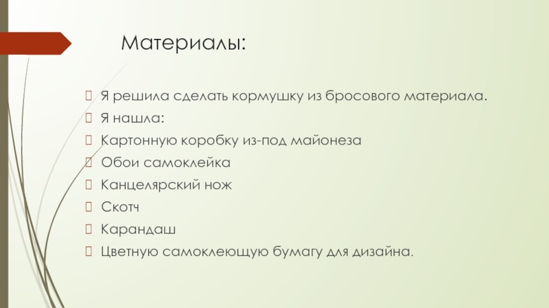 Материалы:Я решила сделать кормушку из бросового материала.Я нашла:Картонную коробку из-под майонеза Обои самоклейкаКанцелярский ножСкотч КарандашЦветную самоклеющую бумагу