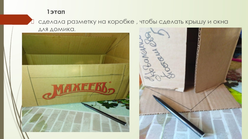 1этап сделала разметку на коробке , чтобы сделать крышу и окна для