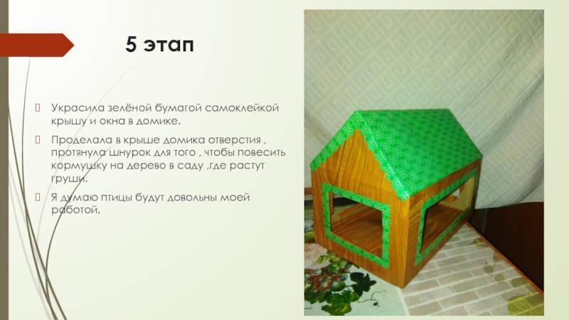 5 этапУкрасила зелёной бумагой самоклейкой крышу и окна в домике.Проделала в крыше домика отверстия , протянула шнурок