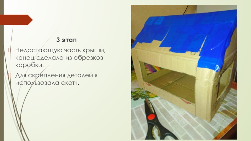 3 этапНедостающую часть крыши, конец сделала из обрезков коробки.Для скрепления деталей я использовала скотч.