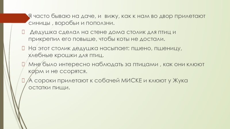 Я часто бываю на даче, и вижу, как к нам во двор прилетают синицы , воробьи и поползни. Дедушка сделал на стене дома столик для птиц и прикрепил его повыше, чтобы коты не достали.На этот столик
