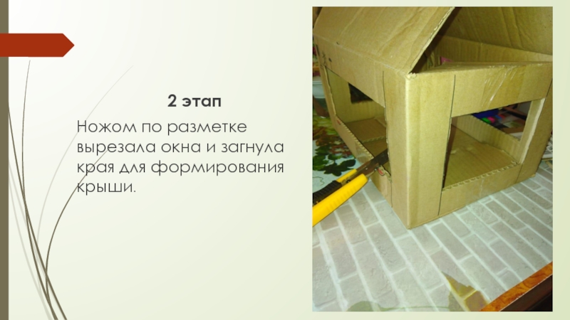 2 этапНожом по разметке вырезала окна и загнула края для формирования крыши.