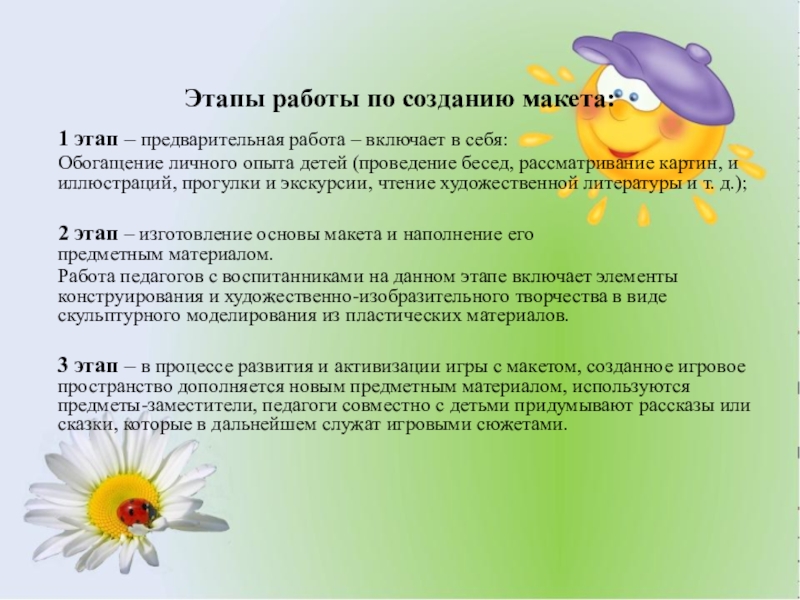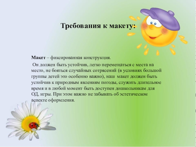 места на место, не бояться случайных сотрясений (в условиях большой группы детей это особенно важно), наш макет должен быть устойчив к природным явлениям погоды, служить длительное время и в любой момент быть доступен дошкольникам для ОД, игры. При этом важно не забывать об эстетическом аспекте оформления.