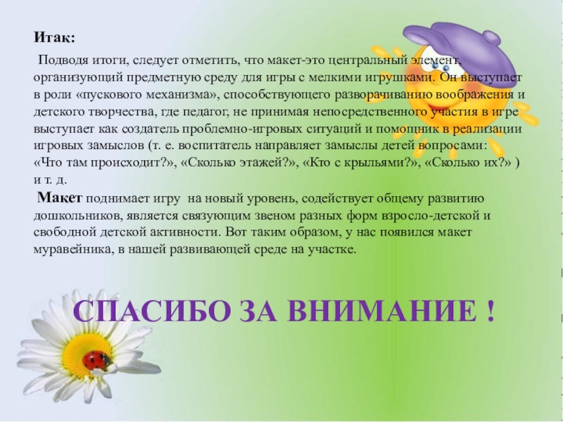 Макет поднимает игру на новый уровень, содействует общему развитию дошкольников, является связующим звеном разных форм взросло-детской и свободной детской активности. Вот таким образом, у нас появился макет муравейника, в нашей развивающей среде на участке.