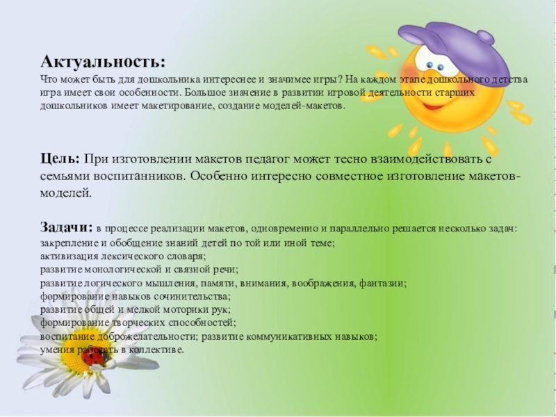 Цель: При изготовлении макетов педагог может тесно взаимодействовать с семьями воспитанников. Особенно интересно совместное изготовление макетов-моделей.