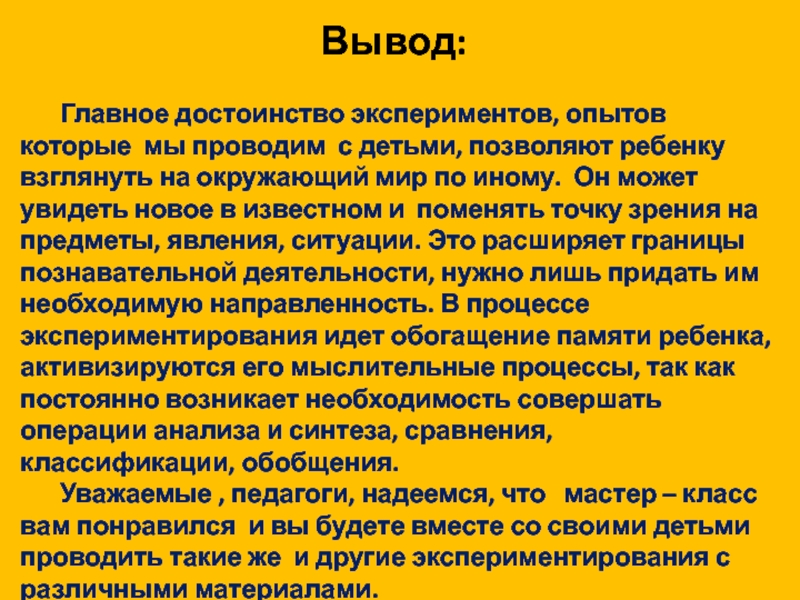 Уважаемые , педагоги, надеемся, что мастер – класс вам понравился и вы будете вместе со своими детьми проводить такие же и другие экспериментирования с различными материалами.