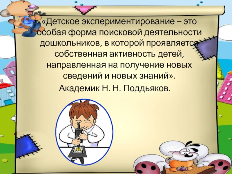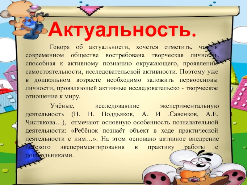 Учёные, исследовавшие экспериментальную деятельность (Н. Н. Поддьяков, А. И .Савенков, А.Е.Чистякова…), отмечают основную особенность познавательной деятельности: «Ребёнок познаёт объект в ходе практической деятельности с ним…». На этом основано активное внедрение детского экспериментирования в практику работы с дошкольниками.