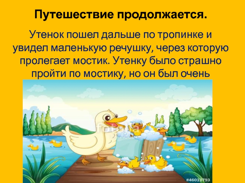 через которую пролегает мостик. Утенку было страшно пройти по мостику, но он был очень любопытный.