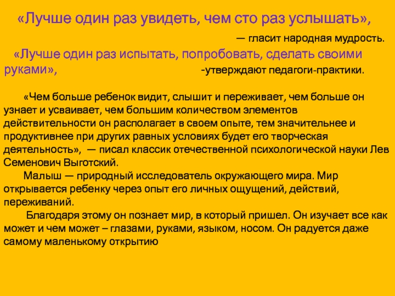«Чем больше ребенок видит, слышит и переживает, чем больше он узнает и усваивает, чем большим количеством элементов действительности он располагает в своем опыте, тем значительнее и продуктивнее при других равных условиях будет его творческая деятельность», — писал классик отечественной психологической науки Лев Семенович Выготский.