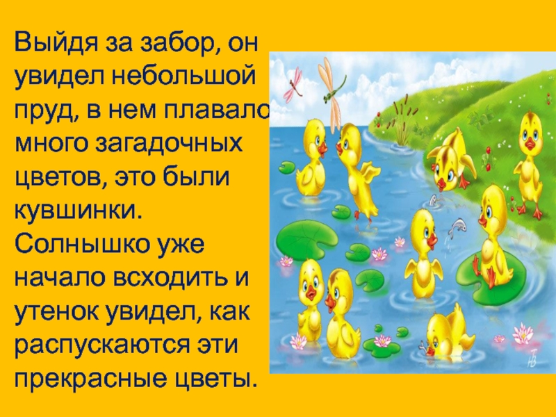 много загадочных цветов, это были кувшинки. Солнышко уже начало всходить и утенок увидел, как распускаются эти прекрасные цветы.