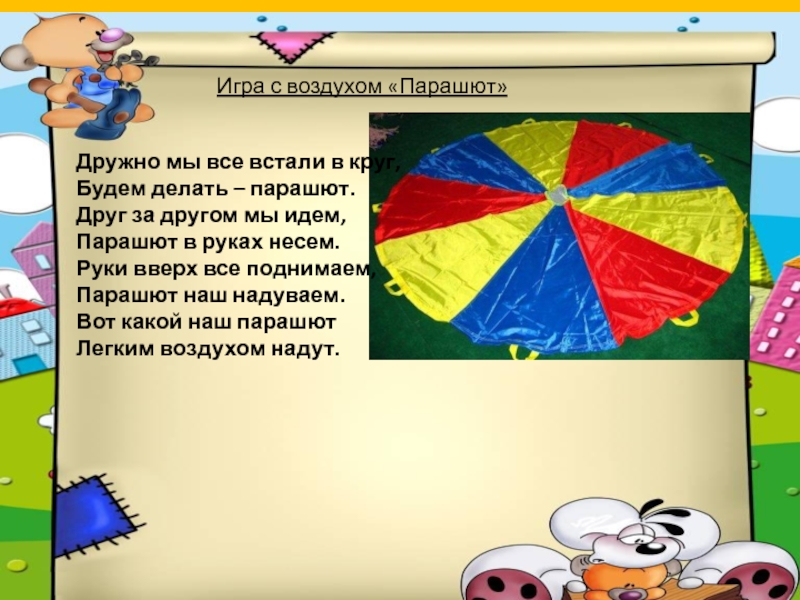 Будем делать – парашют. Друг за другом мы идем, Парашют в руках несем.