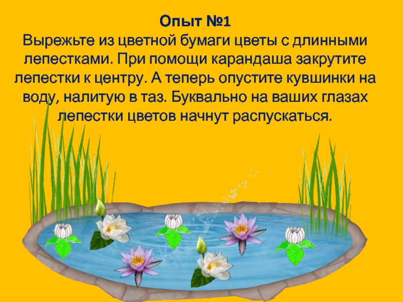 При помощи карандаша закрутите лепестки к центру. А теперь опустите кувшинки на воду, налитую в таз. Буквально на ваших глазах лепестки цветов начнут распускаться.