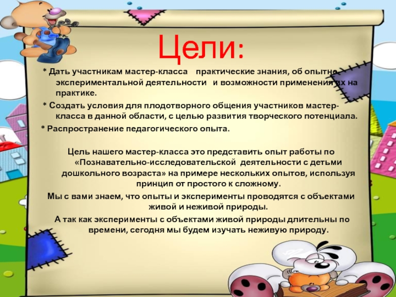 Цель нашего мастер-класса это представить опыт работы по «Познавательно-исследовательской деятельности с детьми дошкольного возраста» на примере нескольких опытов, используя принцип от простого к сложному.