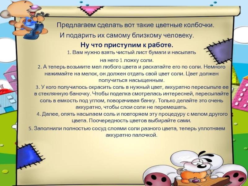 3. У кого получилось окрасить соль в нужный цвет, аккуратно пересыпьте ее в стеклянную баночку. Чтобы поделка смотрелась интересней, пересыпайте соль в емкость под углом, поворачивая банку. Только делайте это очень аккуратно, чтобы слои соли не перемешать.