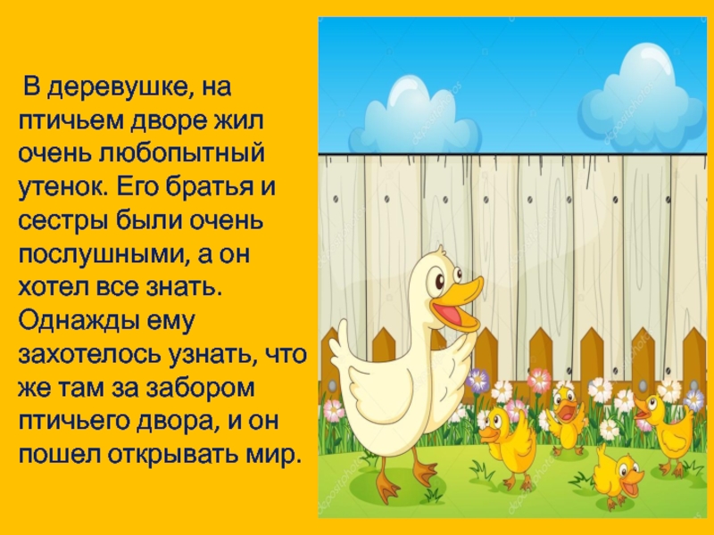 Его братья и сестры были очень послушными, а он хотел все знать. Однажды ему захотелось узнать, что же там за забором птичьего двора, и он пошел открывать мир.