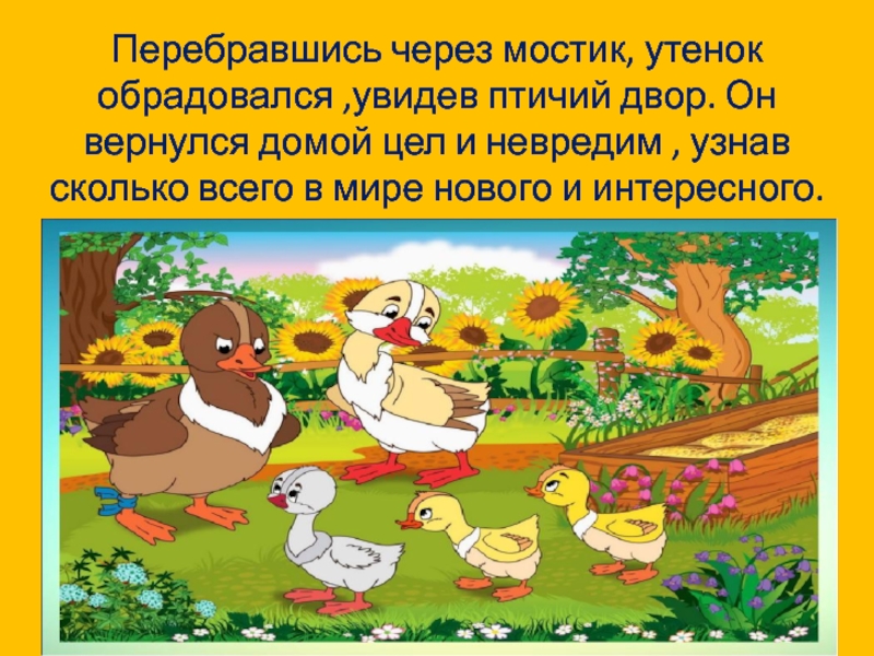 Перебравшись через мостик, утенок обрадовался ,увидев птичий двор. Он вернулся