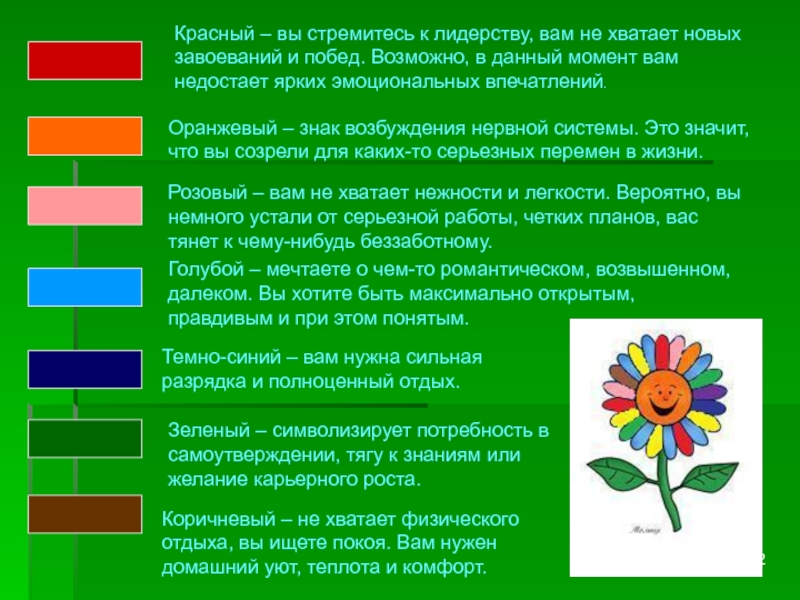 Зеленый – символизирует потребность в самоутверждении, тягу к знаниям или желание карьерного роста.