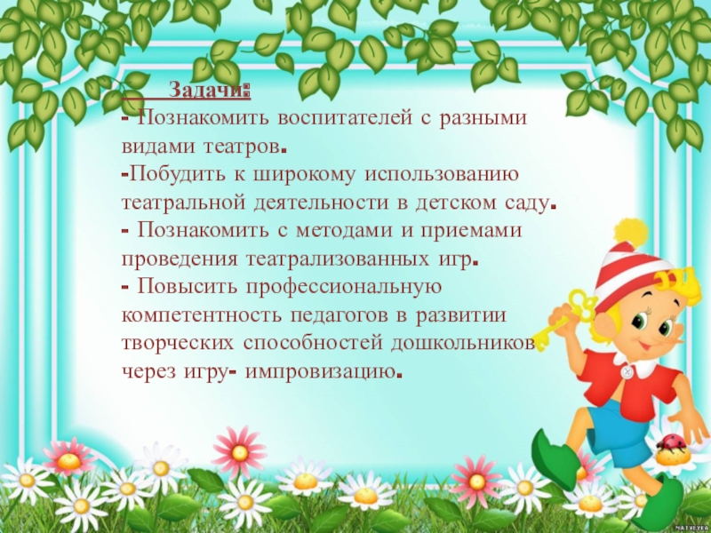 - Повысить профессиональную компетентность педагогов в развитии творческих способностей дошкольников через игру- импровизацию.