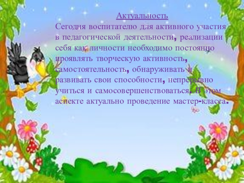 личности необходимо постоянно проявлять творческую активность, самостоятельность, обнаруживать и развивать свои способности, непрерывно учиться и самосовершенствоваться. В этом аспекте актуально проведение мастер-класса.