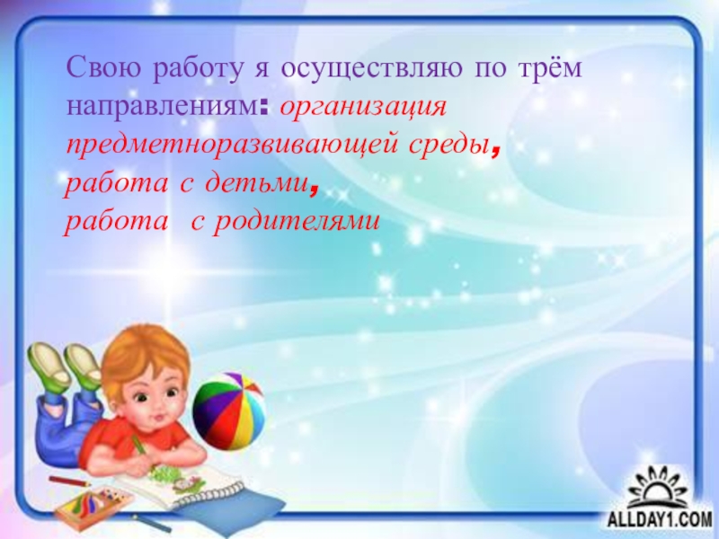 Слайд 14Свою работу я осуществляю по трём направлениям: организация предметноразвивающей среды,