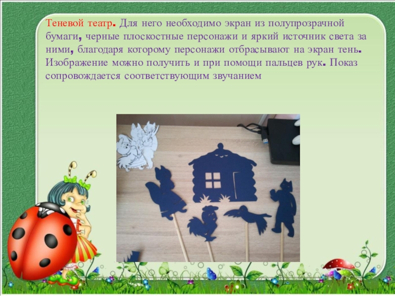 Слайд 17Теневой театр. Для него необходимо экран из полупрозрачной бумаги, черные плоскостные