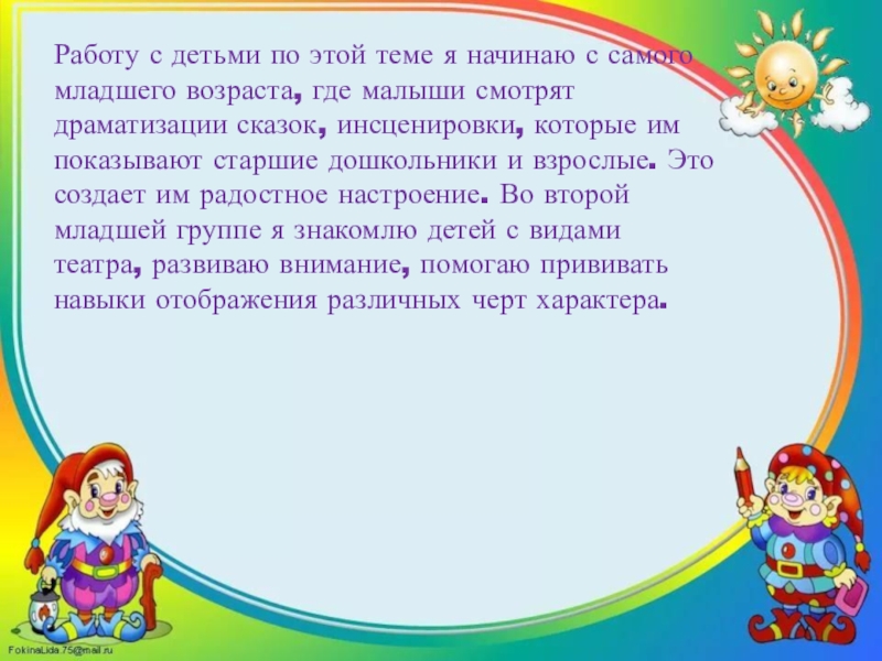 возраста, где малыши смотрят драматизации сказок, инсценировки, которые им показывают старшие дошкольники и взрослые. Это создает им радостное настроение. Во второй младшей группе я знакомлю детей с видами театра, развиваю внимание, помогаю прививать навыки отображения различных черт характера.