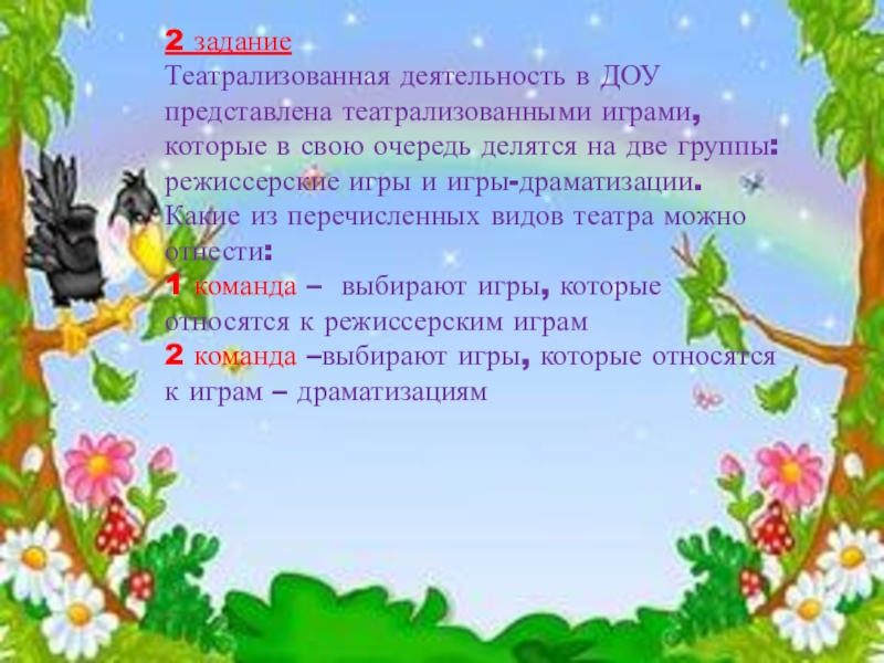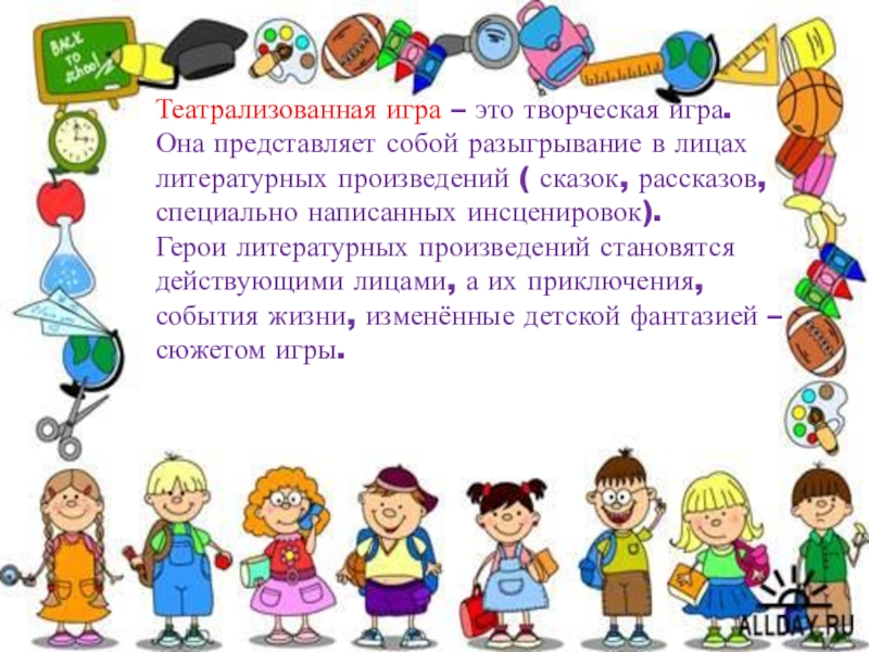 Слайд 7Театрализованная игра – это творческая игра. Она представляет собой разыгрывание в