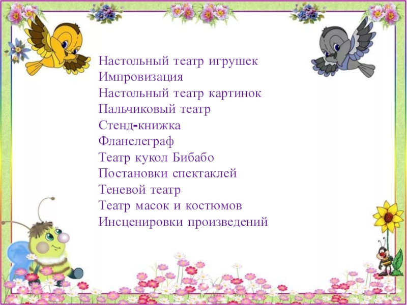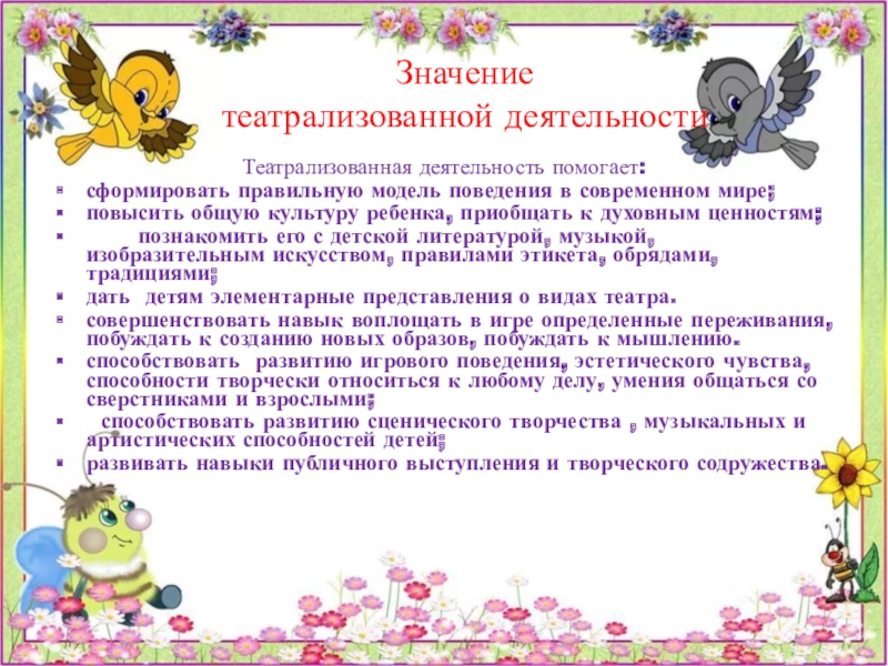 произведений, сказок, импровизации - разыгрывание сюжета без предварительной подготовки. Такой театр увлекает детей тем, что, надевая костюмы и маски дети сами становятся героями спектакля.