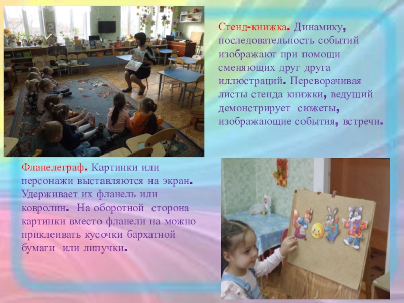 Фланелеграф. Картинки или персонажи выставляются на экран. Удерживает их фланель или ковролин. На оборотной сторона картинки вместо фланели на можно приклеивать кусочки бархатной бумаги или липучки.