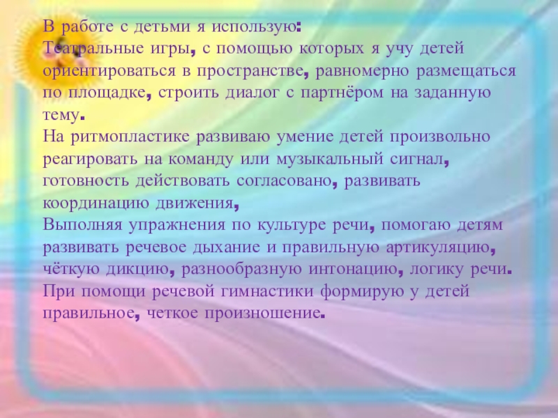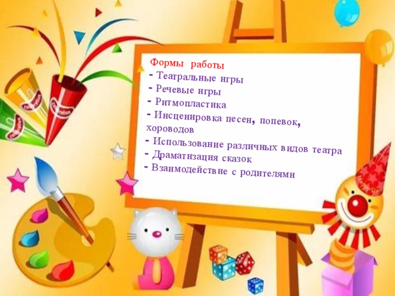 знакомлю их с театральной терминологией, с основными видами театрального искусства, воспитываю культуру поведения. В работе над спектаклем учу сочинять этюды по сказкам; развиваю навыки действий с воображаемыми предметами, умение пользоваться интонациями, выражающими разнообразные эмоциональные состояния (грустно, радостно, сердито, удивленно, восхищённо, жалобно и т. д.).