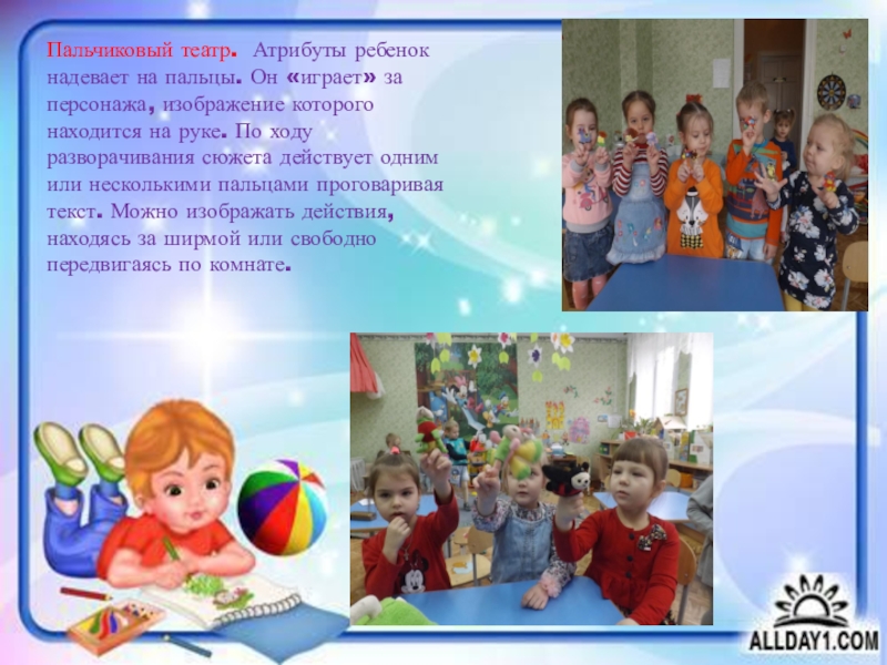Слайд 18Пальчиковый театр. Атрибуты ребенок надевает на пальцы. Он «играет» за персонажа,