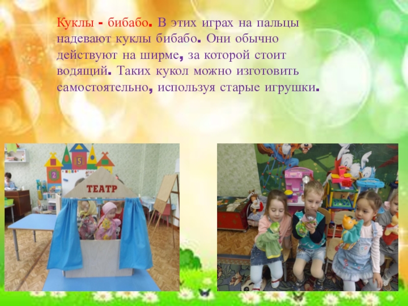 Слайд 19Куклы - бибабо. В этих играх на пальцы надевают куклы бибабо.