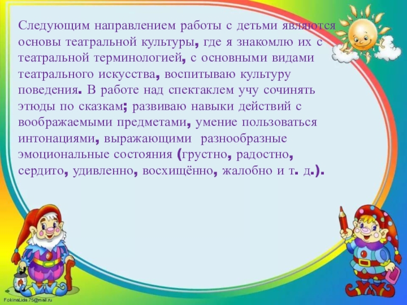Слайд 22Следующим направлением работы с детьми являются основы театральной культуры, где я