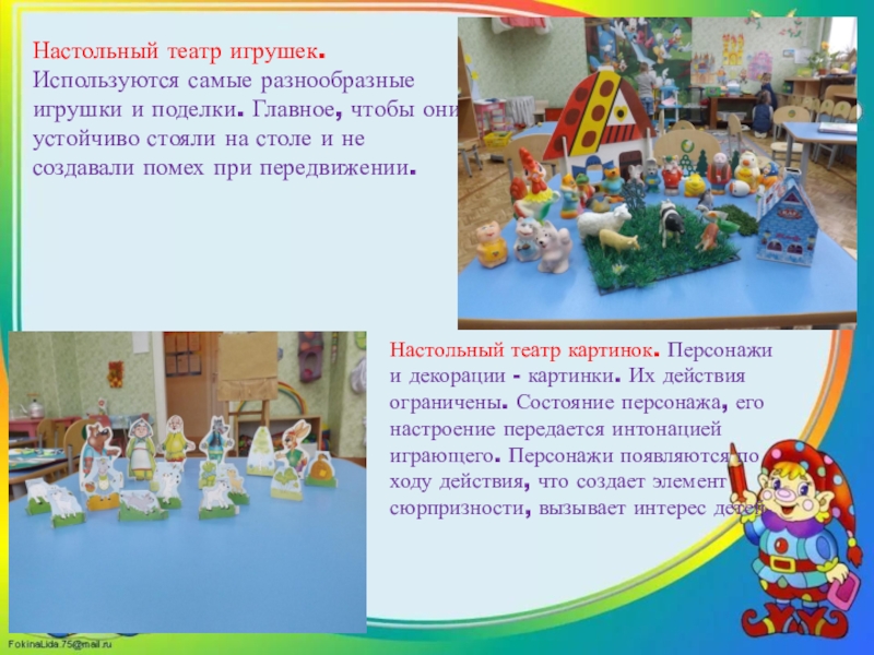 Настольный театр картинок. Персонажи и декорации - картинки. Их действия ограничены. Состояние персонажа, его настроение передается интонацией играющего. Персонажи появляются по ходу действия, что создает элемент сюрпризности, вызывает интерес детей.
