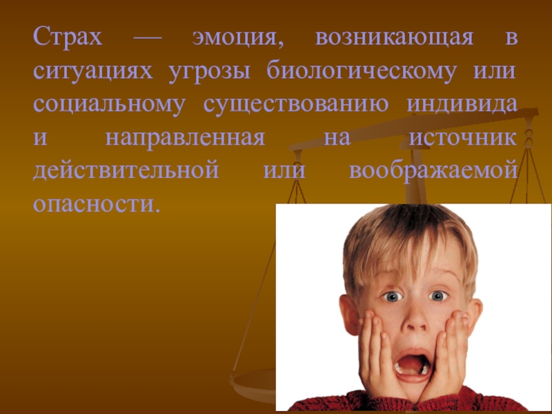 Слайд 4Страх — эмоция, возникающая в ситуациях угрозы биологическому или социальному существованию