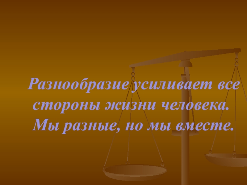 Слайд 1Разнообразие усиливает все стороны жизни человека. Мы разные, но мы вместе.