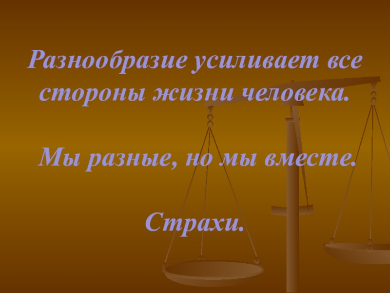 Слайд 3Разнообразие усиливает все стороны жизни человека. Мы разные, но мы вместе. Страхи.