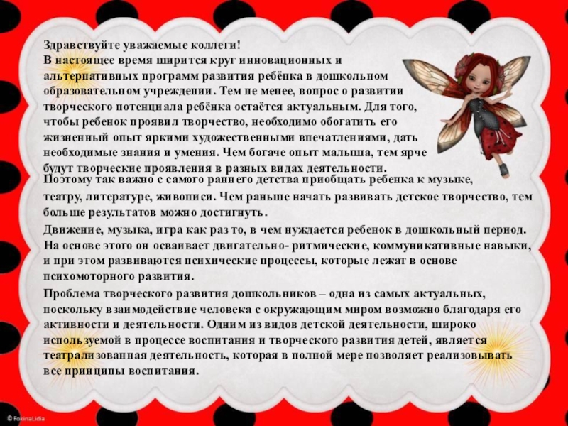 Проблема творческого развития дошкольников – одна из самых актуальных, поскольку взаимодействие человека с окружающим миром возможно благодаря его активности и деятельности. Одним из видов детской деятельности, широко используемой в процессе воспитания и творческого развития детей, является театрализованная деятельность, которая в полной мере позволяет реализовывать все принципы воспитания.