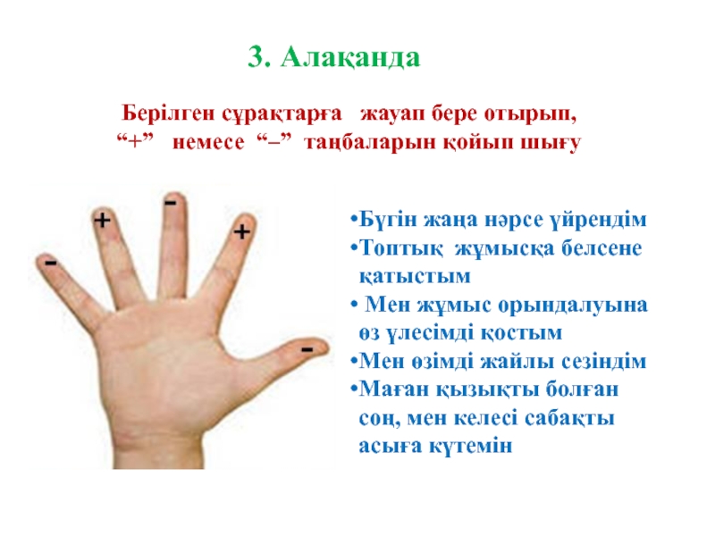 Берілген сұрақтарға жауап бере отырып, “+” немесе “–” таңбаларын қойып шығу