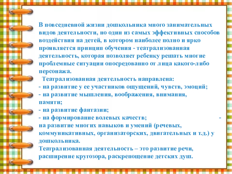 - на развитие фантазии; - на формирование волевых качеств; - на развитие многих навыков и умений (речевых, коммуникативных, организаторских, двигательных и т.д.) у дошкольника. Театрализованная деятельность – это развитие речи, расширение кругозора, раскрепощение детских душ.
