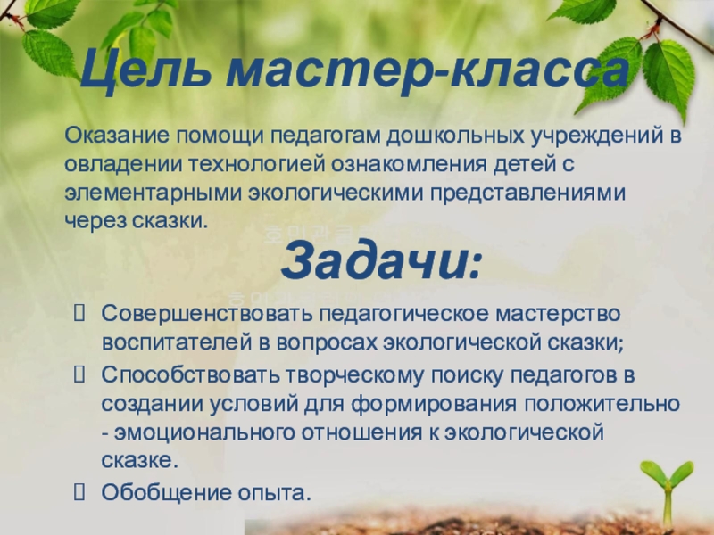 Оказание помощи педагогам дошкольных учреждений в овладении технологией ознакомления детей с элементарными экологическими представлениями через сказки.