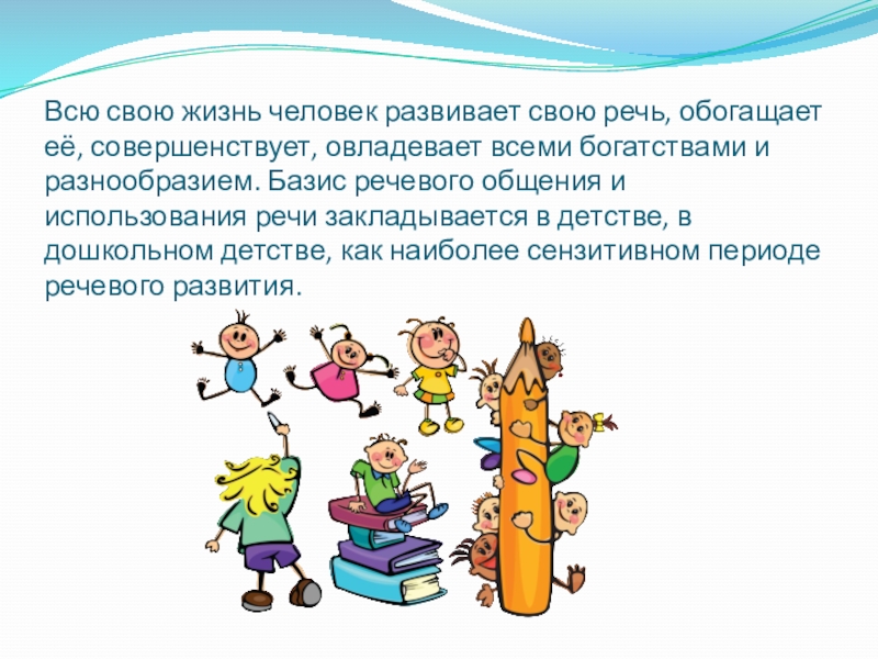 всеми богатствами и разнообразием. Базис речевого общения и использования речи закладывается в детстве, в дошкольном детстве, как наиболее сензитивном периоде речевого развития.