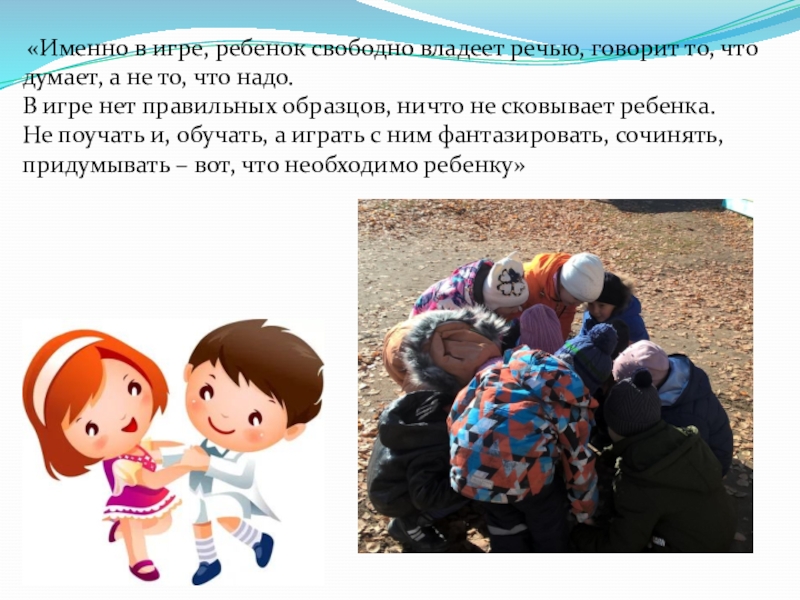 Слайд 5 «Именно в игре, ребенок свободно владеет речью, говорит то, что