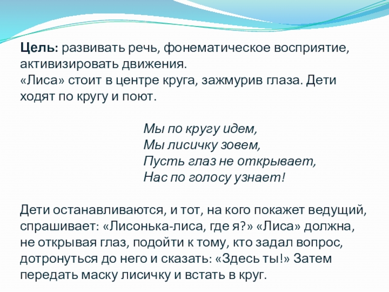 Дети останавливаются, и тот, на кого покажет ведущий, спрашивает: «Лисонька-лиса, где я?» «Лиса» должна, не открывая глаз, подойти к тому, кто задал вопрос, дотронуться до него и сказать: «Здесь ты!» Затем передать маску лисичку и встать в круг.