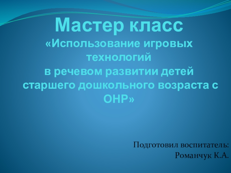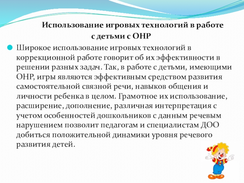 Широкое использование игровых технологий в коррекционной работе говорит об их эффективности в решении разных задач. Так, в работе с детьми, имеющими ОНР, игры являются эффективным средством развития самостоятельной связной речи, навыков общения и личности ребенка в целом. Грамотное их использование, расширение, дополнение, различная интерпретация с учетом особенностей дошкольников с данным речевым нарушением позволит педагогам и специалистам ДОО добиться положительной динамики уровня речевого развития детей.