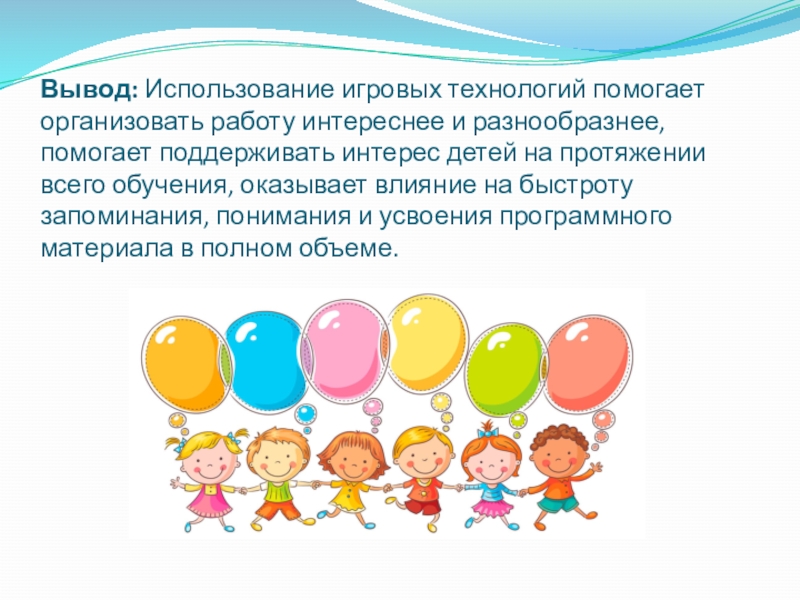 Слайд 16Вывод: Использование игровых технологий помогает организовать работу интереснее и разнообразнее, помогает