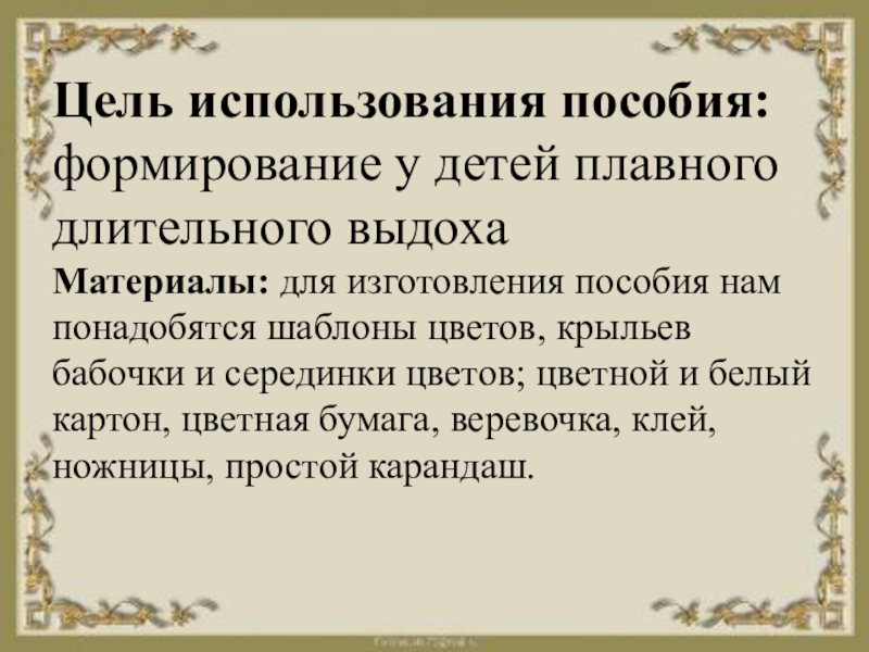 Слайд 3Цель использования пособия:  формирование у детей плавного длительного выдоха Материалы: для изготовления пособия