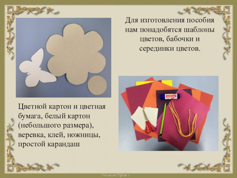 Для изготовления пособия нам понадобятся шаблоны цветов, бабочки и серединки цветов. Цветной картон и цветная бумага, белый