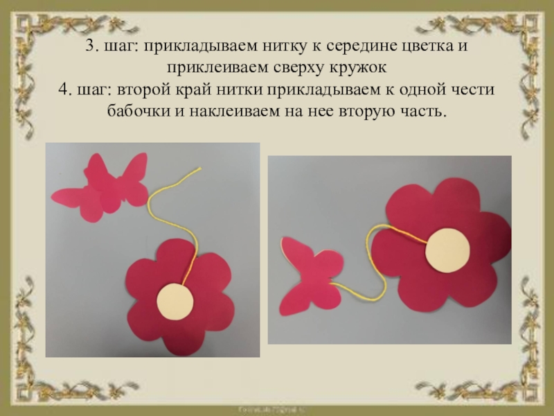 Слайд 73. шаг: прикладываем нитку к середине цветка и приклеиваем сверху кружок 4.